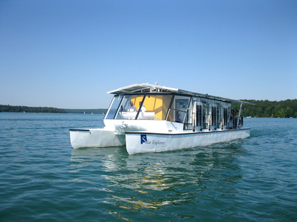 Von Altenhof aus gehen wir an Bord der Solar Explorer auf Entdeckungsfahrt. Unser solar betriebener Katamaran gleitet nahezu lautlos über das Wasser. Während der einstündigen Schnupperfahrt nehmen wir den See unter die Lupe – wir keschern, mikroskopieren, nehmen Wasser- und Bodenproben oder halten mit dem Fernglas Ausschau auf dem Arbeitsdeck. Welcher Greifvogel kreist dort über dem Wald? Wie kann ein ganzes Schiff mit der Kraft der Sonne angetrieben werden? Was ist der Silberschatz des Werbellinsees? Und wie viel Leben steckt eigentlich in einem Glas Wasser? Klimafreundliche Mobilität, Biodiversitätsschutz, Leben im UNESCO-Biospährenreservat Schorfheide-Chorin, die Ökologie und Geschichte eines einzigartigen Klarwassersees – an Bord der Solar Explorer fließen all diese Themen zusammen. Während der einstündigen Fahrt begleitet Sie unsere Referentin für Umweltbildung. Sie können die bereitgestellte Ausrüstung an Bord nutzen und den See selbst erforschen.